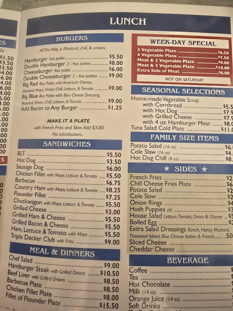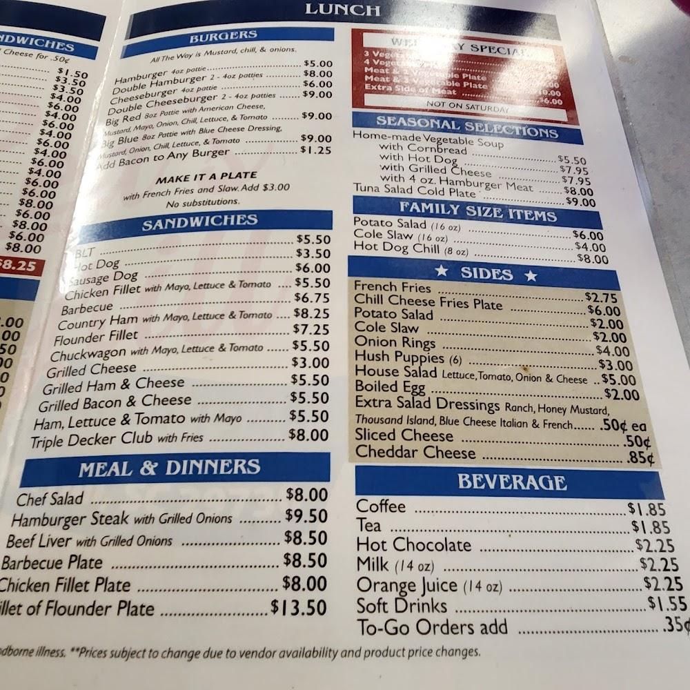 The menu at Red's Grill focuses on American comfort food. Breakfast is a highlight, featuring classics like eggs, bacon, grits, and giant pancakes. Lunch options include hearty sandwiches, burgers, and salads. Seasonal specials add variety, showcasing dishes like homemade vegetable soup. Guests can enjoy portions that are perfect for sharing or a quick bite.
